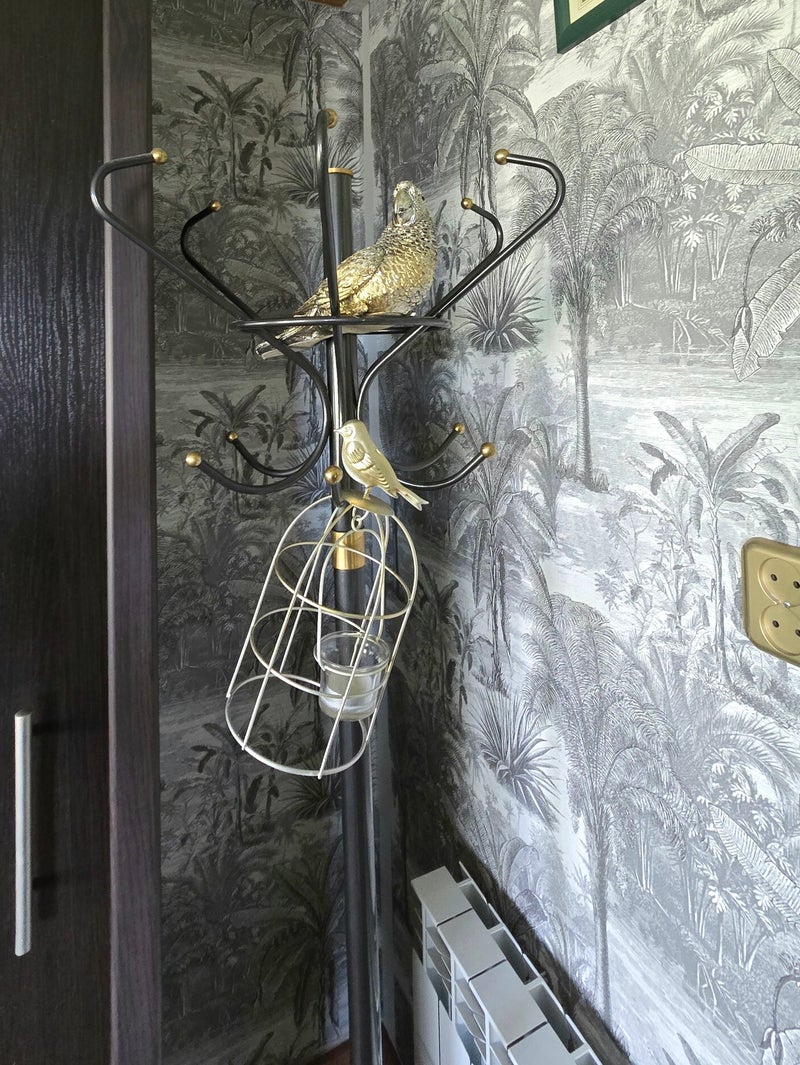 Stunningly imaginative concept—country living decor with birds in cages and tropical plants, all in monochrome gray blends pastoral charm with lush, exotic elements, yet tones it all down with a sleek, modern, grayscale palette.